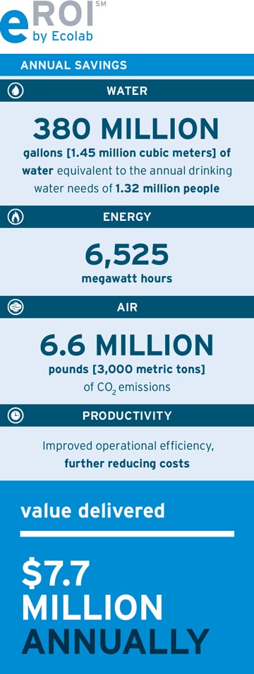 The water savings were the result of a leadership commitment on the part of the company and a partnership with Ecolab.Through smart water management, digital technologies, such as 3D TRASAR™ Technology, and operational management services provided by Ecolab, the steel maker optimized its cooling water use in a water-stressed area. Scaling and fouling in the cooling water made it difficult to achieve higher recirculation rates in the cooling system without using a lot of water. The issues were addressed, thanks to 3D TRASAR’s real-time monitoring and control, which is used to detect and correct variations in source water quality, reducing the demand for freshwater. These efforts also led to cost savings and reductions in energy consumption.